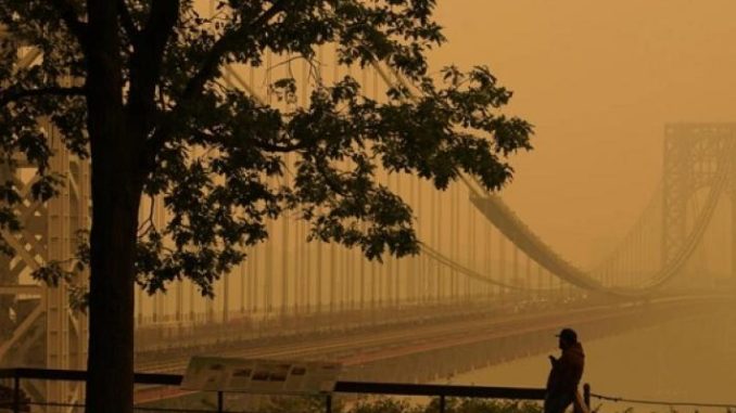 La ville de New York est plongée ce mercredi dans un brouillard orange et marron, conséquence des feux de forêt qui ravagent le Québec, qui rendent l’air très difficilement respirable pour les 8,5 millions d’habitants de la « Grosse Pomme ».