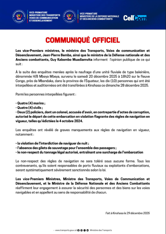 Selon un communiqué officiel conjoint des deux ministères, ces personnes ont été acheminées à Kinshasa le dimanche 28 décembre 2025, après les enquêtes ouvertes à la suite du naufrage de l’unité fluviale H/B Mbeya Mbeya, survenu le samedi 20 décembre 2025, à 18h20. Les investigations ont permis d’identifier de lourdes responsabilités dans le départ de cette embarcation, autorisé en violation manifeste des règles de navigation en vigueur.