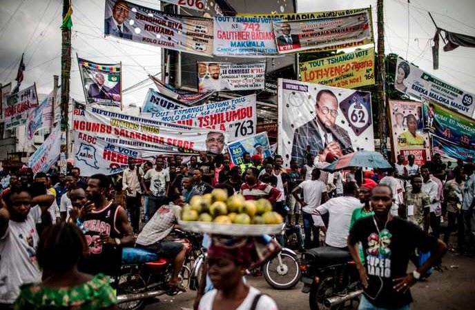 Electoral banners are displayed in the Ndjili district of Kinshasa on December 19, 2018, after campaigning for Democratic Republic of Congo’s general elections was called off in Kinshasa by the authorities on security grounds. Democratic Republic of Congo goes to the polls on December 23, 2018 in elections which could see the country emerge from 17 years of conflict-ridden rule under the incumbent controversial president.