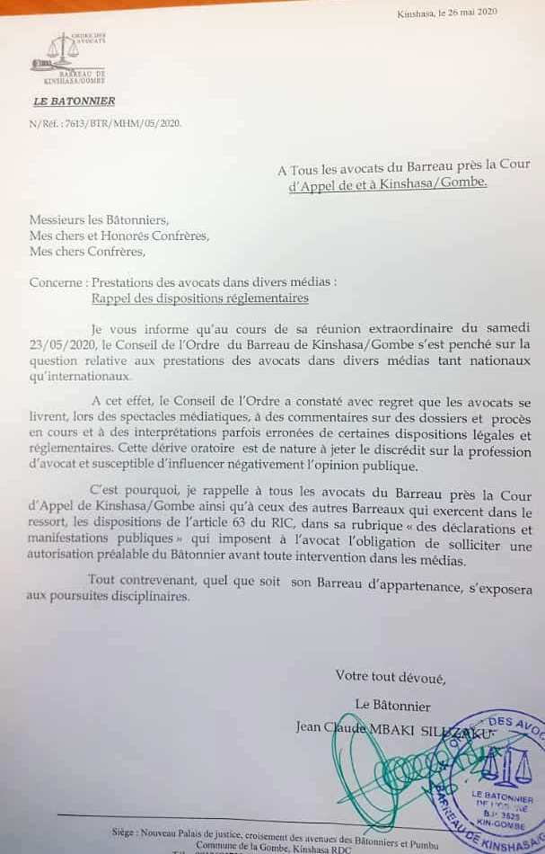 La décision émane de la réunion extraordinaire du samedi 23 mai. Interdiction pour les avocats du barreau près la cour de cassation Kinshasa/Gombe d’intervenir sur les médias nationaux et internationaux sans l’autorisation préalable du bâtonnier.