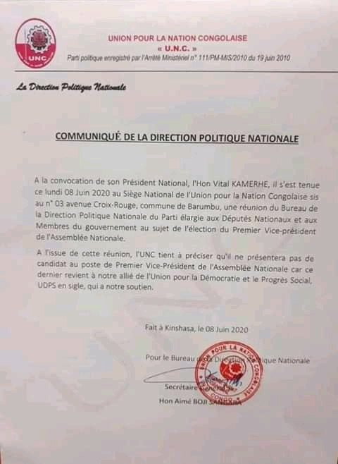 A l’issue d’une réunion de sa direction politique tenue ce lundi 8 juin 2020, élargie aux députés nationaux, a manifesté son soutien à la candidature de la députée Patricia Nseya au poste du vice-président de l’Assemblée nationale, L’UNC de Vital Kamerhe.
